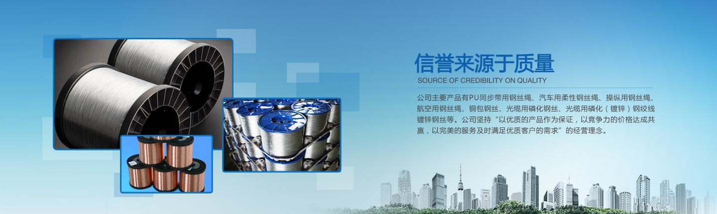 公司主要產品有PU同步帶用鋼絲繩、汽車用柔性鋼絲繩、操縱用鋼絲繩、航空用鋼絲繩、銅包鋼絲、光纜用磷化鋼絲、光纜用磷化(鍍鋅)鋼絞線、鍍鋅鋼絲等。經過多年的研究、摸索、開發,公司已形成了完整的技術、工藝軟件,產品實物質量均達到國際先進水平。